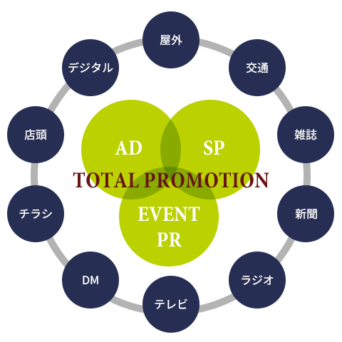 総合広告会社としての強みをいかし、4マス、交通・屋外広告、デジタルメディア、店頭施策、PRまで総合的なプロモーションプランをご提案します。